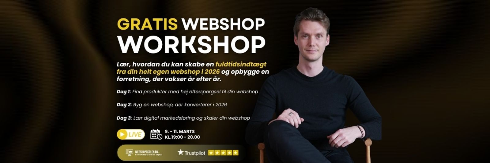 Webshop Kickstarter LIVE: På tre dage lærer du at bygge og skalere din egen webshop og skabe en fuldtidsindkomst i 2026.