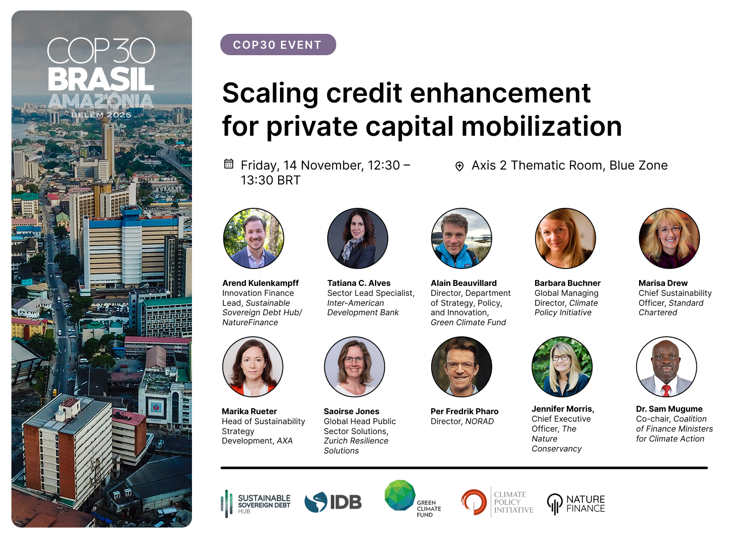 The Task Force on Credit Enhancement for Sustainability-Linked Sovereign Financing for Nature and Climate, established at COP28, brings together MDBs, DFIs, and other stakeholders to address these barriers. At COP 30, the Task Force will launch its recommendations to help standardize and scale sustainability-linked sovereign financing (SSLF) as a credible asset class—broadening investor participation, reducing transaction friction, and delivering impact at scale.