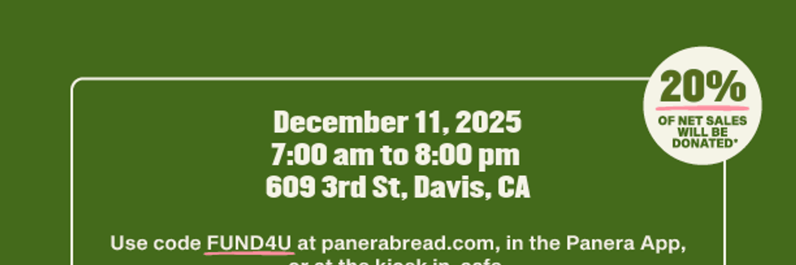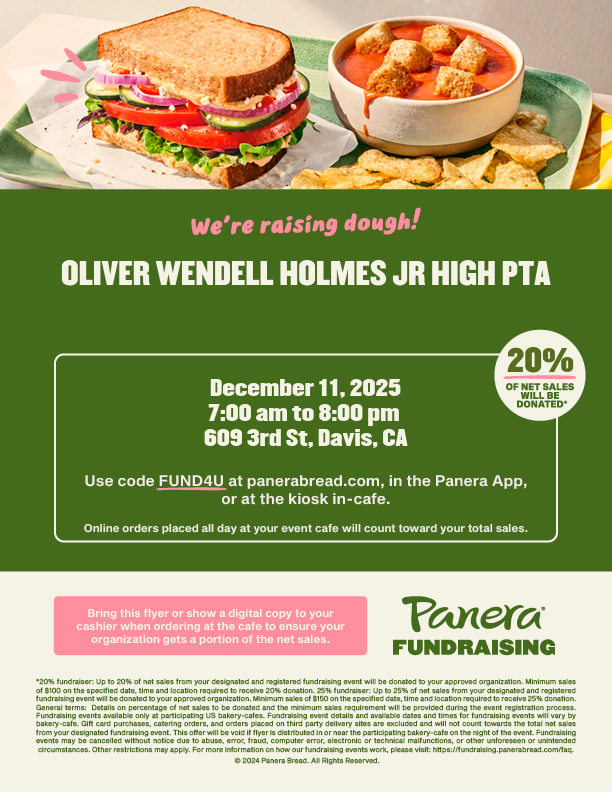 Use code FUND4U at PaneraBread.com, in the app, or in person, and Panera will donate 20 percent of your total bill to the Holmes PTA--at no cost to you!