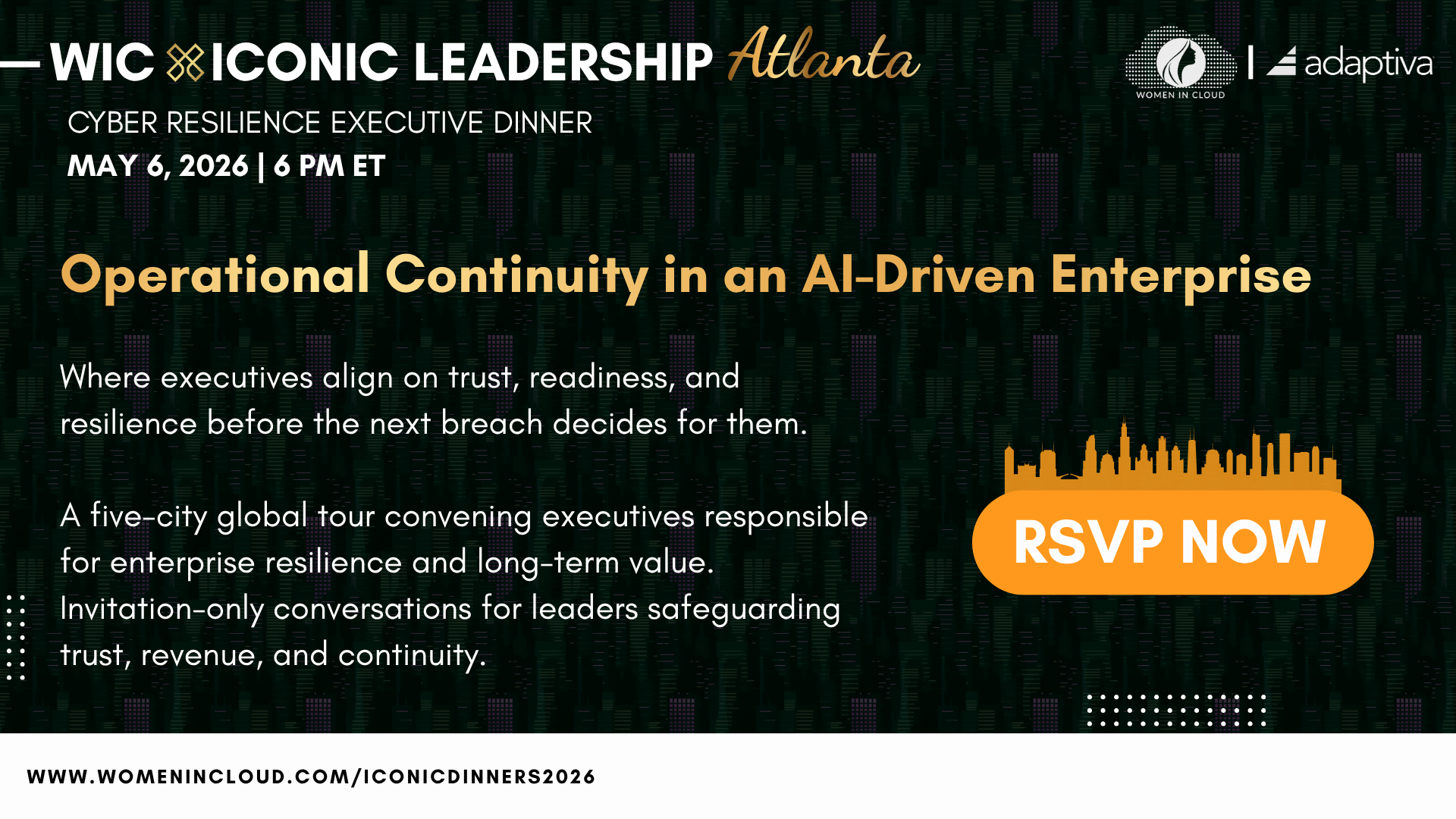 ICONIC Cyber Resilience Leadership Dinners are an invitation-only executive dinner hosted by Women in Cloud in collaboration with Adaptiva.