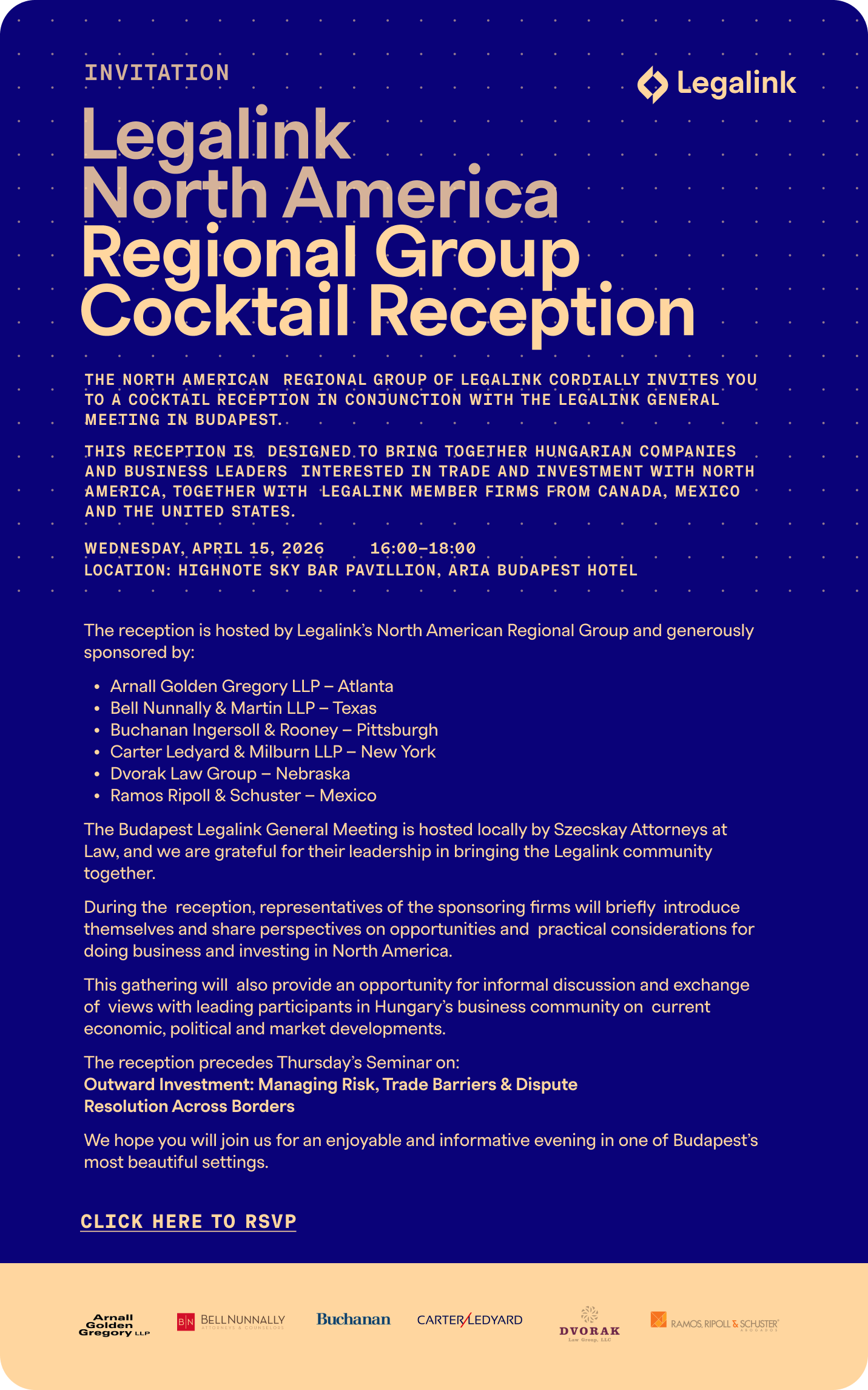 This reception is designed to bring together Hungarian companies and business leaders interested in trade and investment with North America, together with Legalink member firms from Canada, Mexico, and the United States.