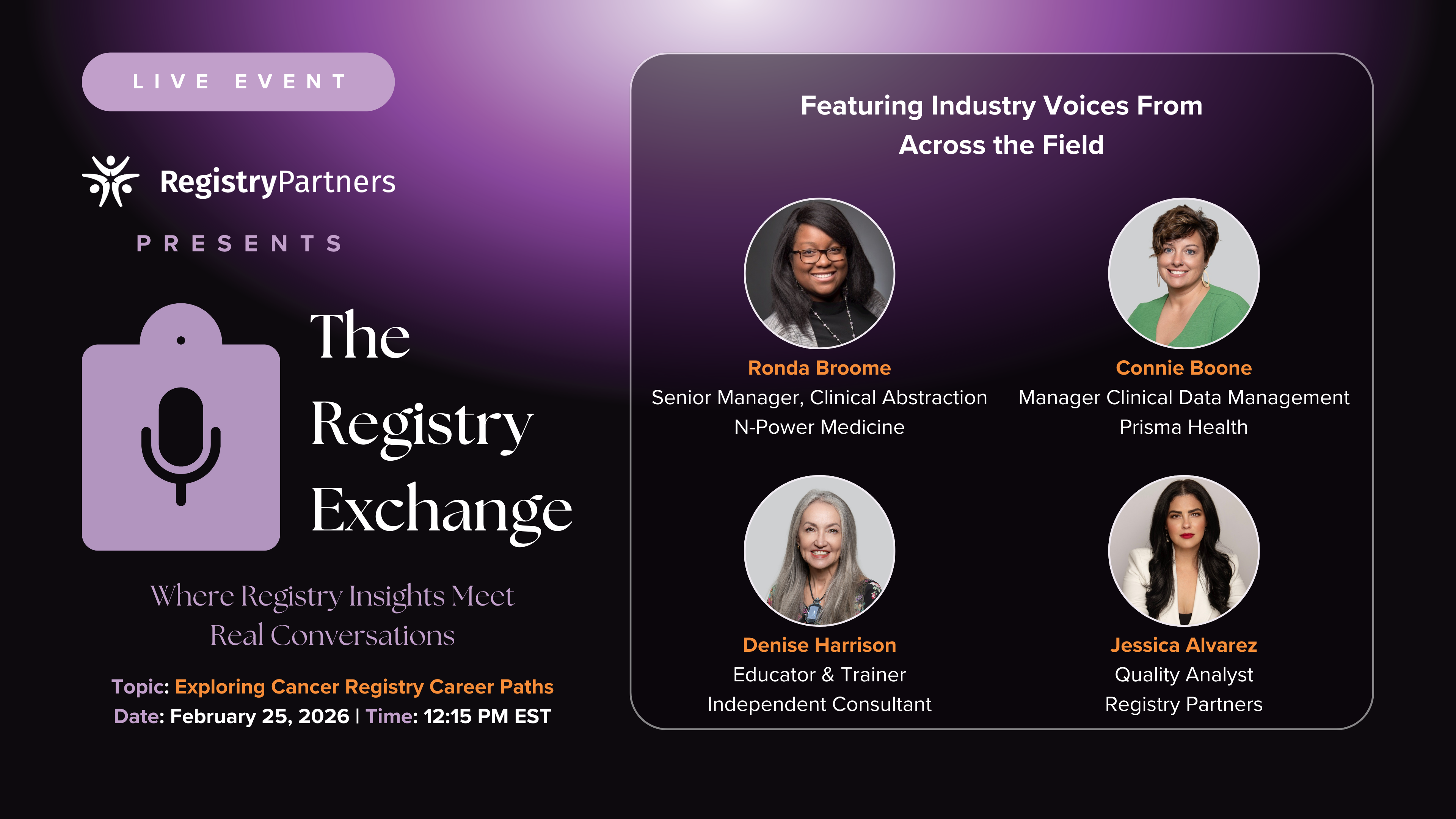 Join Registry Partners for a live Registry Exchange panel exploring the many career paths available to oncology data specialists and registry professionals. Hosted by Karen Mace and Erin Weber, this conversation features panelists Ronda Broome, Denise Harrison, Connie Boone, and Jessica Alvarez as they share how their careers evolved after certification and highlight opportunities beyond traditional abstracting roles, including leadership, consulting, research, and precision medicine. The discussion will also touch on key skills for staying relevant in a data-driven healthcare landscape and offer practical advice for both new and experienced registrars looking to grow or pivot in their careers. This free, informal industry discussion provides real-world perspectives and an inside look at where a registry career can lead.