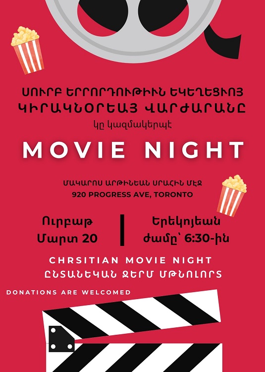 Holy Trinity Armenian Church's Sunday School invites you to Christian Movie Night on Friday, March 20, 2026 at 6:30 pm.