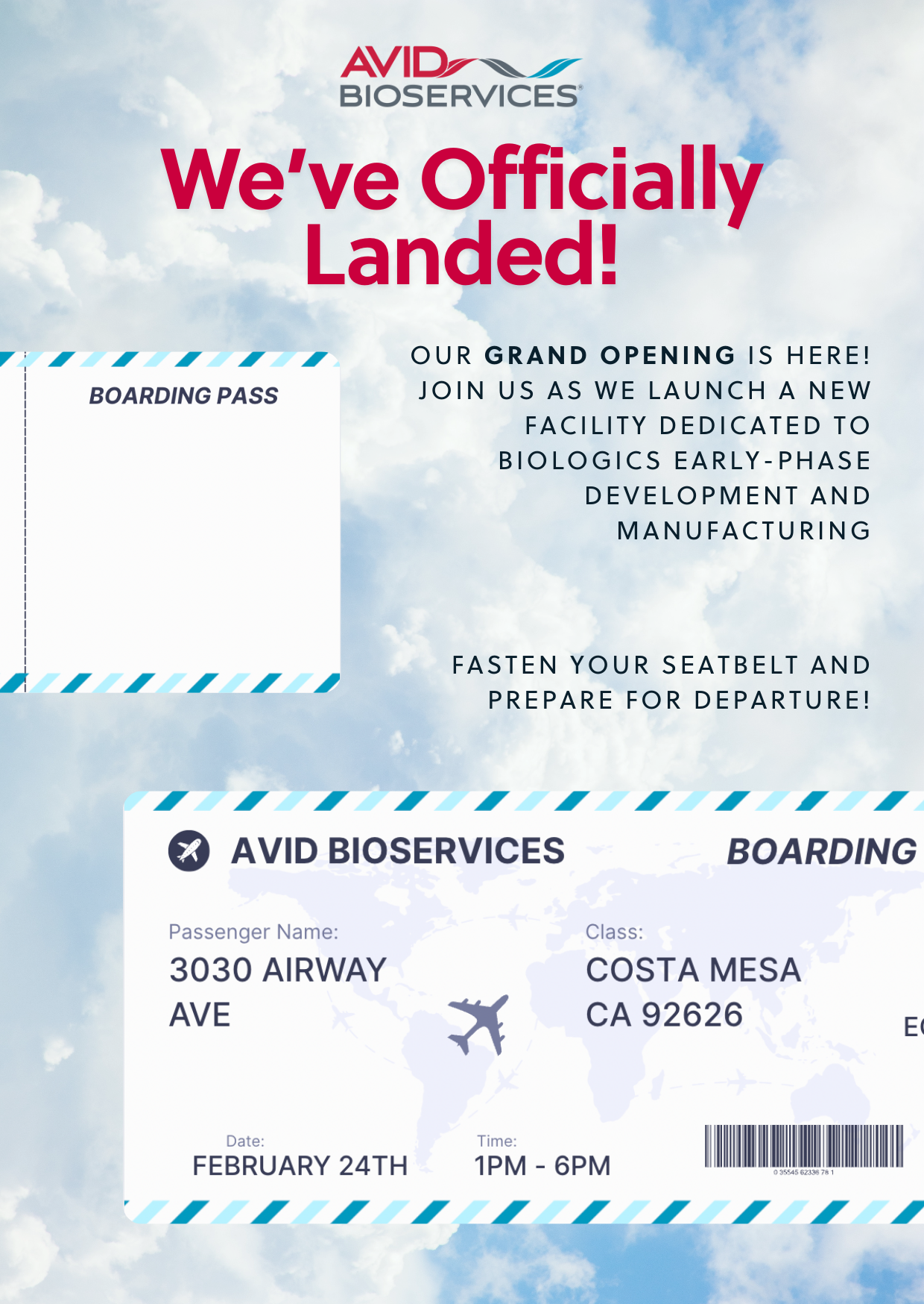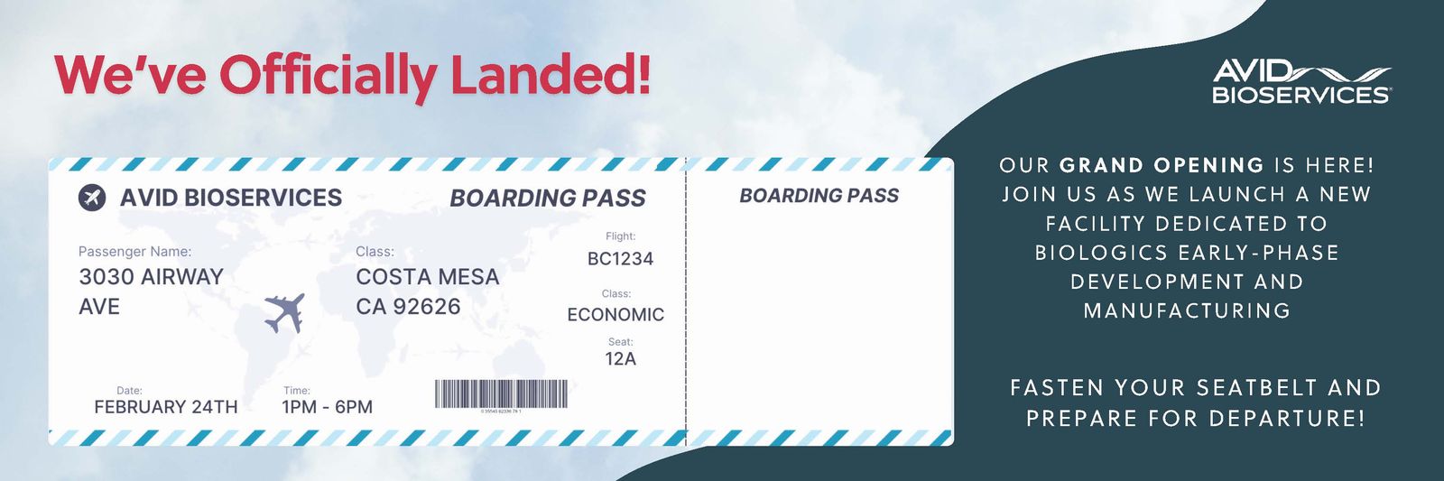Avid Bioservices is pleased to invite you to the grand opening ceremony for our new early-phase biologics development and manufacturing center located in Costa Mesa, California.