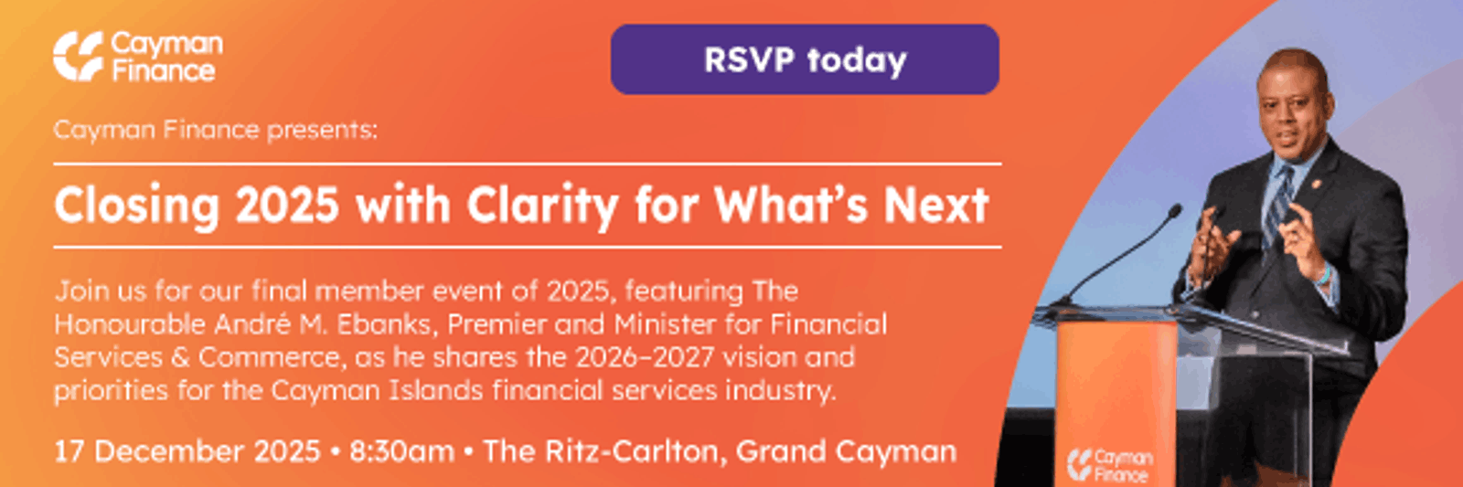 Join us for the final member event of 2025 featuring The Honourable André M. Ebanks, Premier and Minister for Financial Services & Commerce. This session will include a keynote presentation on the Ministry's vision and priorities for 2026-2027. Expect candid insights, strategic updates, and the opportunity to submit your questions in advance through this RSVP form. Seats are limited. We encourage Cayman Finance members to RSVP today. Step confidently into 2026 with a clear perspective on what’s ahead for financial services in the Cayman Islands. 8:30am Registration and light breakfast 9:00am Keynote Presentation 9:45am Networking 10:30am End