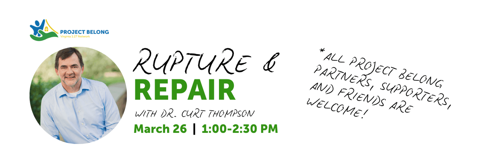 Curt Thompson, MD, is a board certified psychiatrist, author, speaker, and co-host of The Being Known Podcast. Through stories, neuroscience, and biblical reflections, Dr. Thompson will discuss how repairing even small ruptures can lead to greater resilience, beauty, and connection. Please RSVP so that we can reach you with any updates/changes to the schedule!