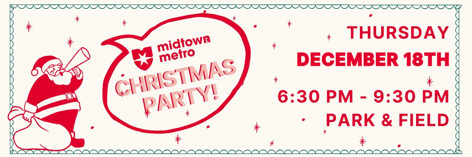 Join volunteers, staff, and friends of Midtown-Metro for a Christmas Party! We have the main room at Park and Field reserved with a cash bar and Midtown-Metro provided apps. Festive dress and ugly Christmas sweaters are encouraged, but not required. Feel free to bring your significant other and friends! Any community members 18+ are welcome to attend, but anyone under 21 will receive a mark upon entry and will be asked to leave immediately if seen drinking alcohol. If you have any questions, please email Marianne (mcavanaghyost@midtown-metro.org) Please RSVP via EVENTBRITE by 9:30 pm, Tuesday, December 16th.