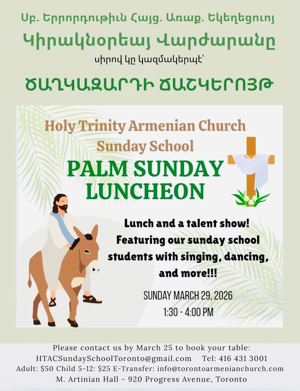 The Holy Trinity Armenian Church's Sunday School invites you to Palm Sunday Luncheon and Talent Show of the students. The event will take place right after Palm Sunday Divine Liturgy in lower level of the church, in Magaros Artinian Hall.