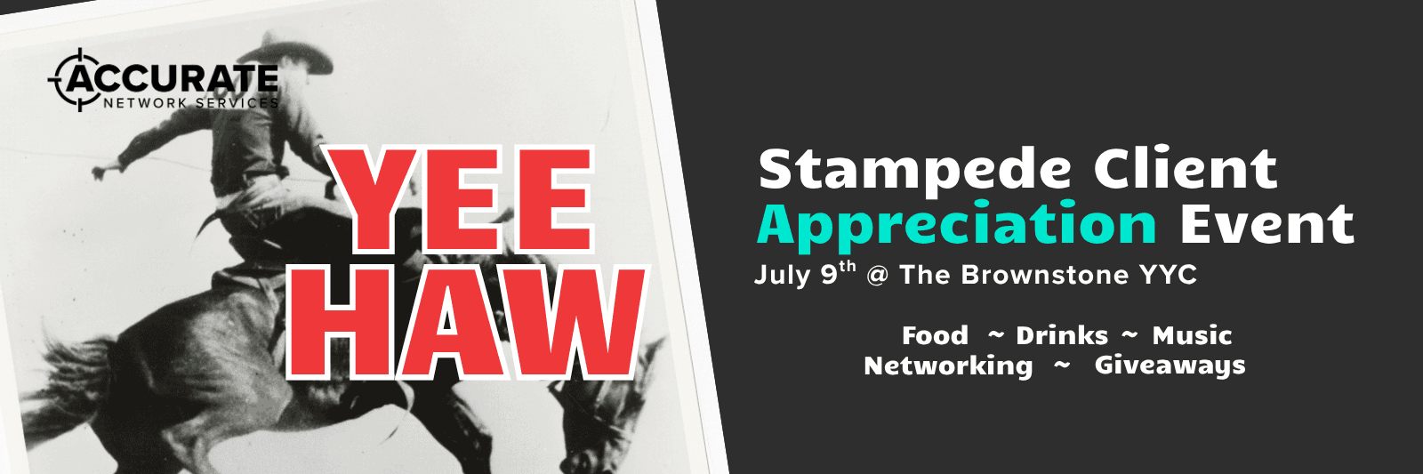 You're cordially invited to a rip-roarin' good time at Accurate Networks' Stampede Client Appreciation Event . Join us at The Brownstone YYC for an afternoon of food, drinks, music, networking, and giveaways.