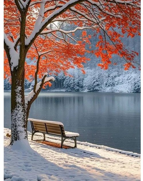 This Friday, we’re painting “Where Love Waits” — a quiet winter moment where everything seems to calm down. A snow-dusted bench resting beside a frozen lake, framed by a tree still holding onto its fiery orange leaves. There’s something so tender about this scene… like a place filled with memories, pauses, and unspoken love.