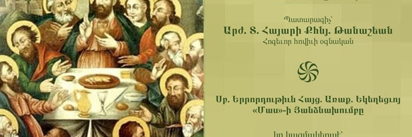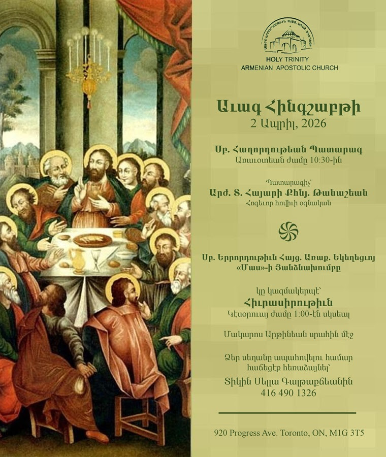 | Maundy Thursday April 2, 2026 10:30 am Divine Liturgy Celebrant: REV. FR. HAYARI TANASHIAN, Pastor’s Assistant 1:00 pm Reception - Օrganized by the "Maas" Baking Committee of the Holy Trinity Armenian Church. To book your table, please contact Mrs. Sella Kaltakdjian at 416 490 1326. ![]() |