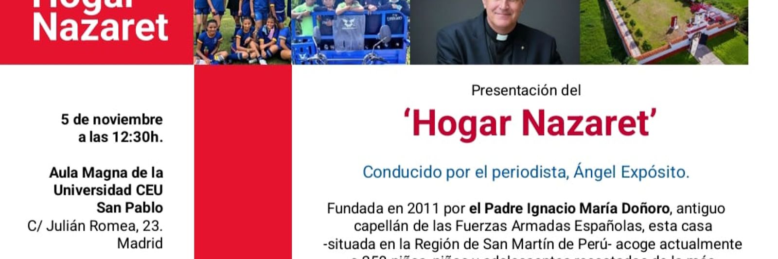 El encuentro contará con la participación del periodista Ángel Expósito, del Padre Ignacio María Doñoro, fundador de Hogar Nazaret, y de la Rectora de la Universidad San Pablo CEU, Rosa Visiedo.