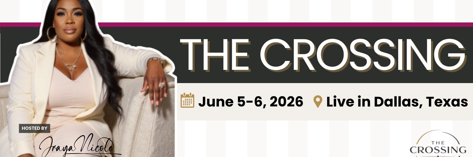 The Crossing is a 1.5-day strategic retreat (June 5-6, 2026) designed for senior corporate women standing at a professional threshold — Between the success they've built and the business they're meant to create.